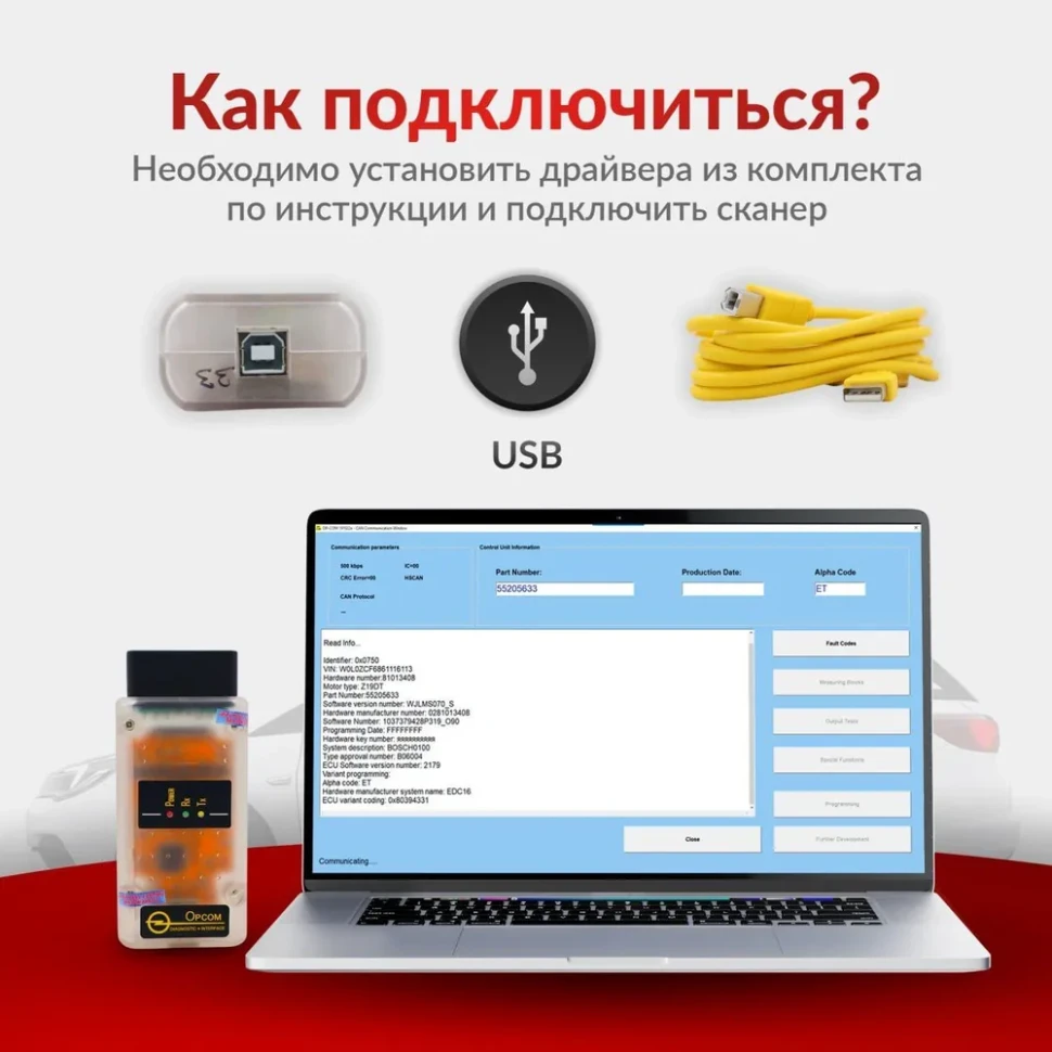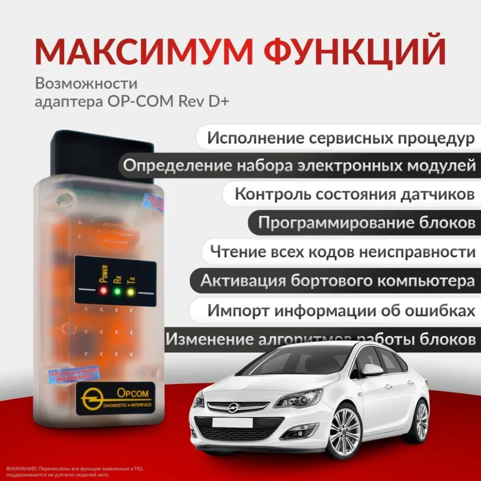- Диагностический адаптер OP-COM Revision D+ — основное устройство для проведения диагностики.