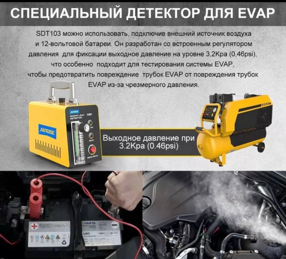 Дымогенератор Autool SDT 103 не оснащен встроенным компрессором, для работы требуется подключить источник воздуха.